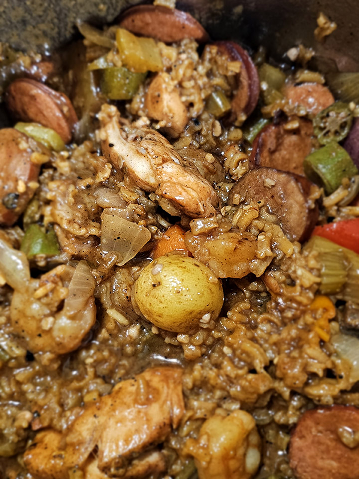 I had a craving the other night and found I had most of the makin’s in the cupboard: sausage, chicken thighs, shrimp, okra, potatoes, carrots, the holy trinity of onions, peppers and celery, plus various spices.