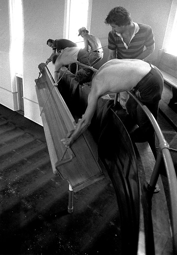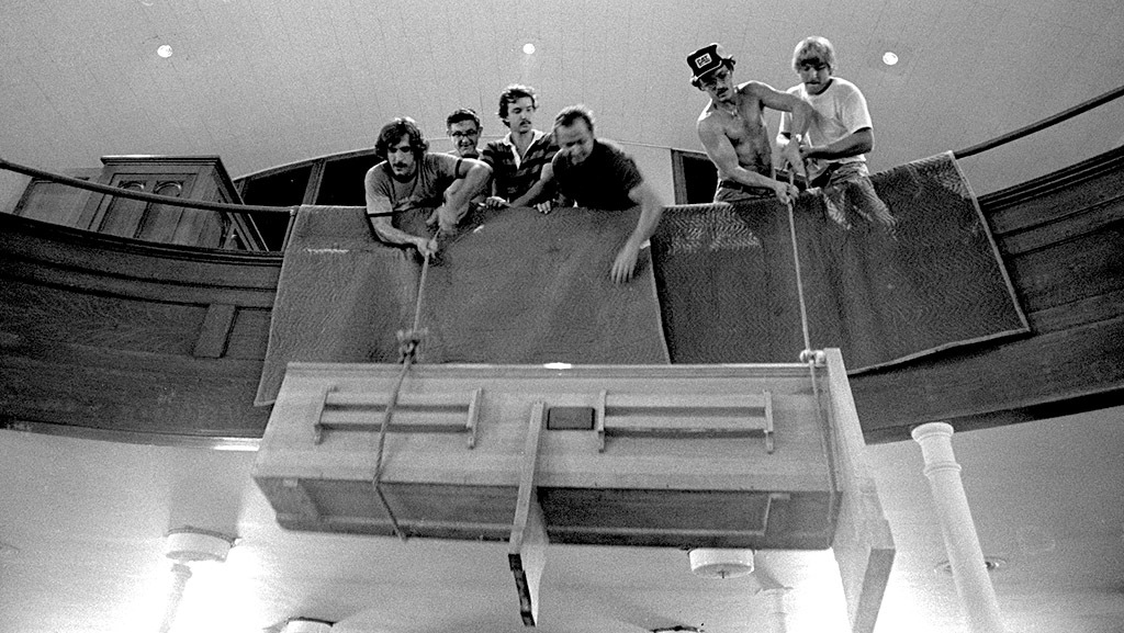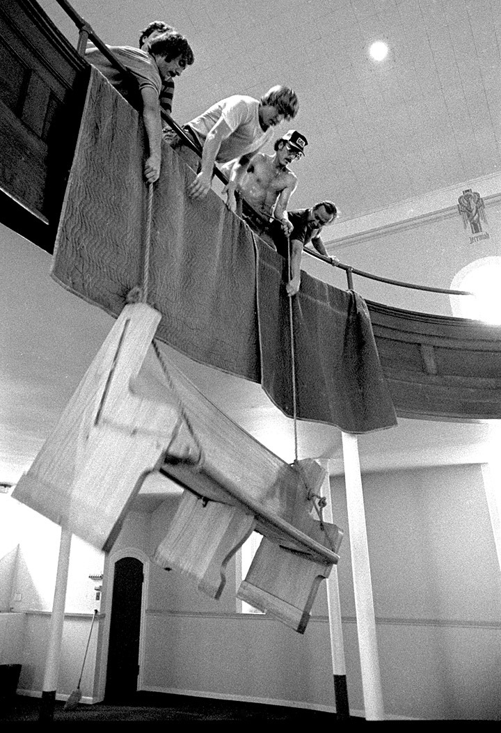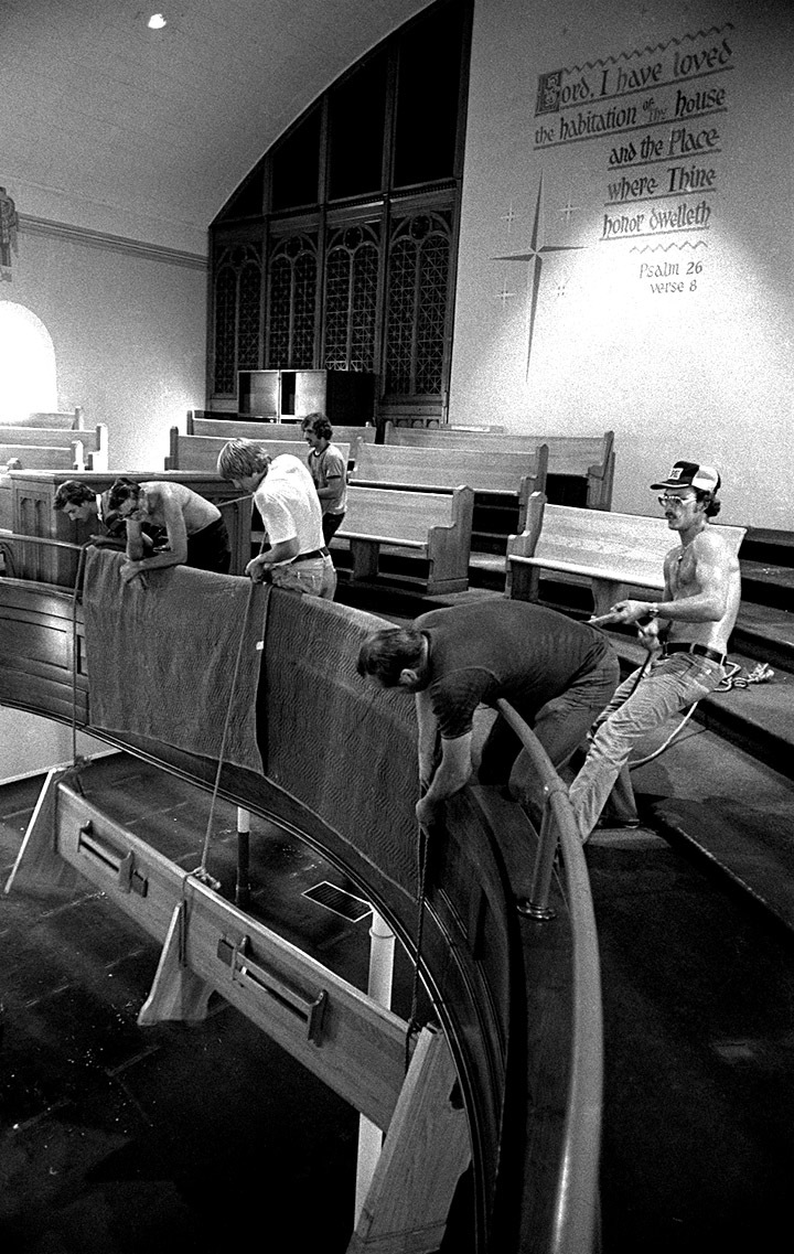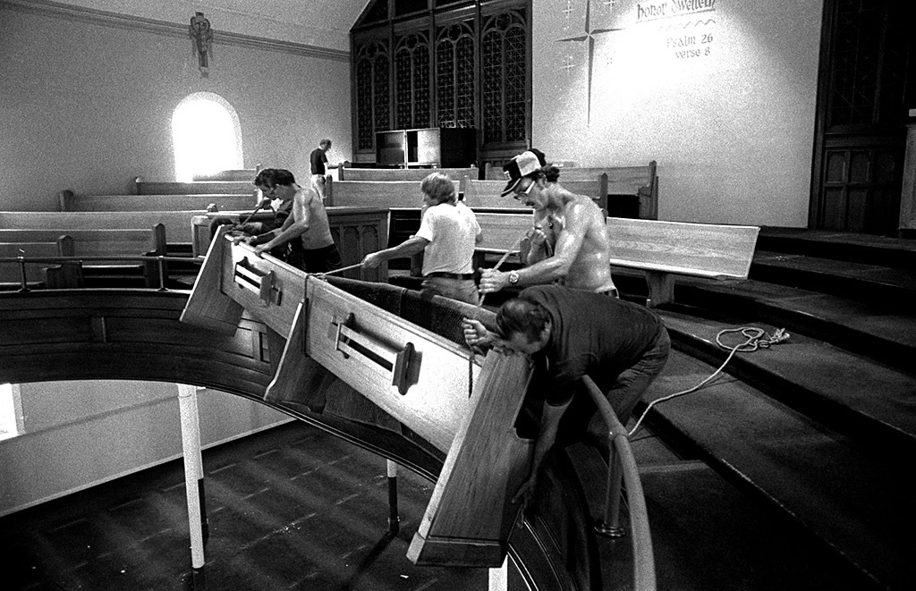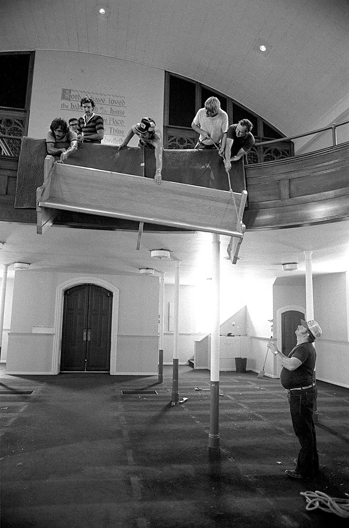 Here’s another series of photos of the demolition of Trinity Lutheran Church. I’m focusing on the balcony and pews this time. I always thought it was impressive how the balcony swept out over the congregation. I always liked to sit in that section.