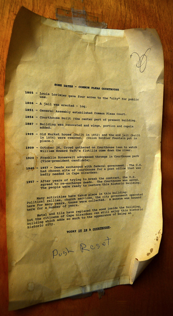 The Missourian had a story July 24, 2012, reporting that the county commission will seek a historic preservation grant from the Missouri Department of Natural Resources to support repairs to the building. I don’t know if the money will go for replacing charred timbers in the dome.