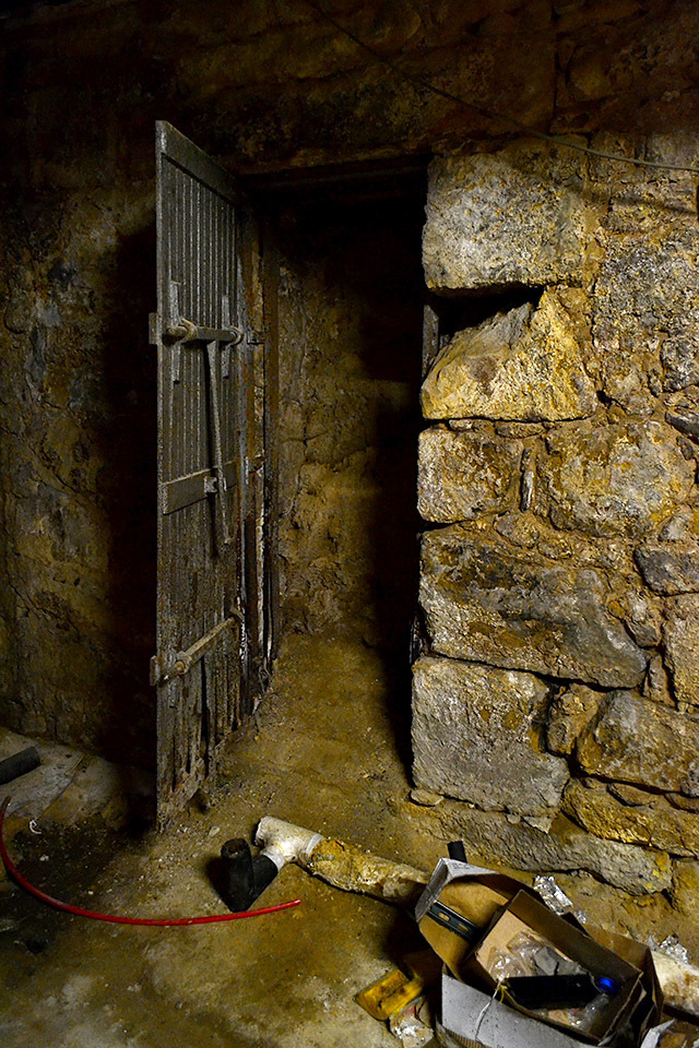 I’m still trying to figure out this room, which is located north of the storage room. It contains a heavy steel door and an iron lattice opening that must have been for ventilation.The dirt floor is just as it was during the Civil War.