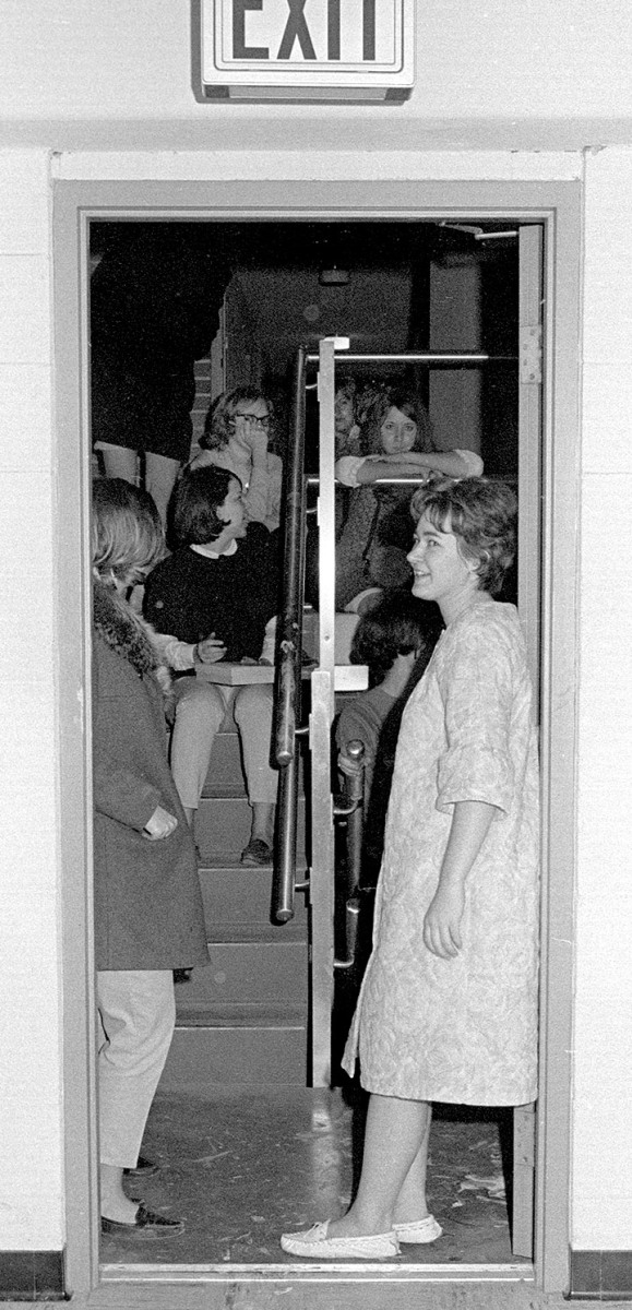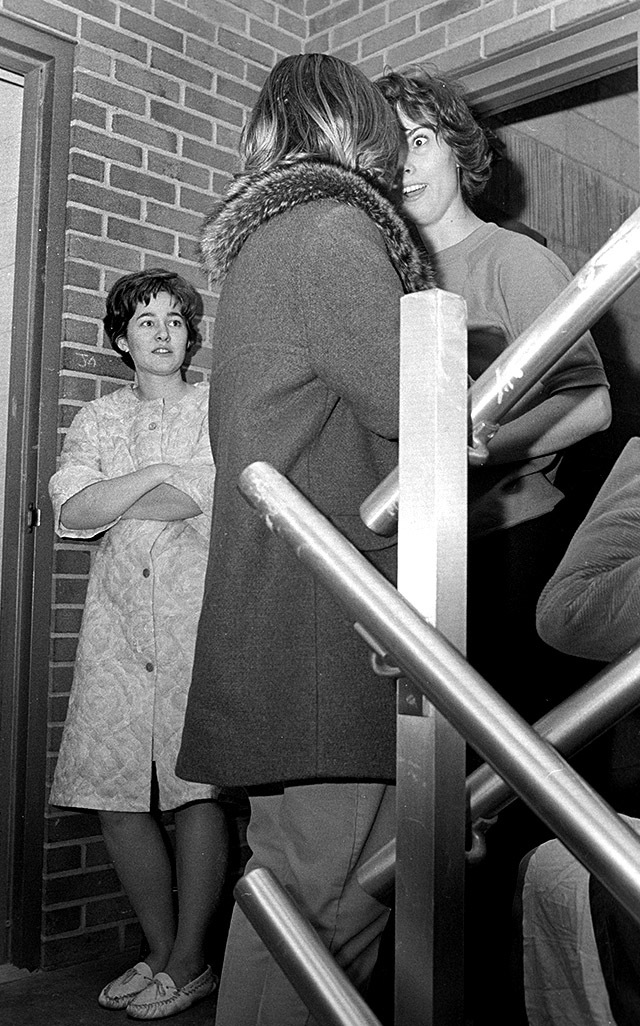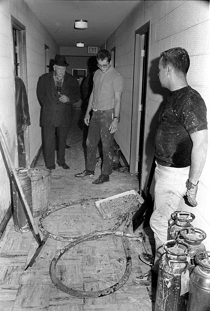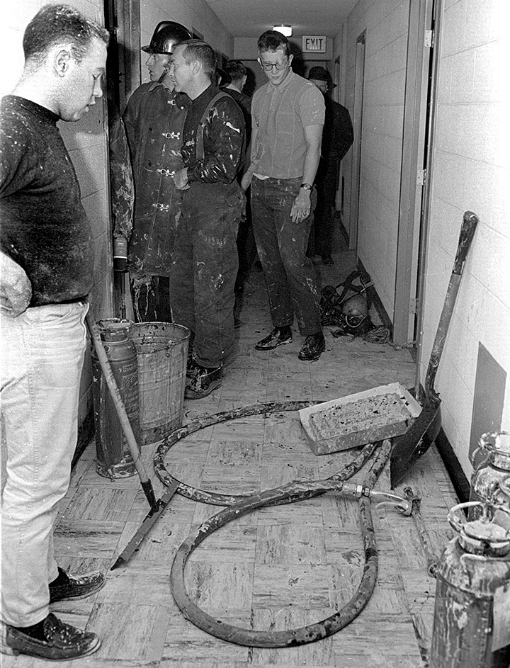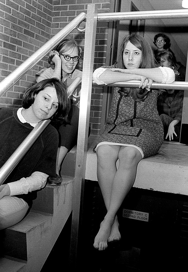 The Missourian’s January 16, 1967, front page lead story was “Cake Fires Girls’ Dorm,” with three of my photos. Clothing and bedding were destroyed and smoke and fire damage were extensive when fire enveloped a room in Dearmont Quadrangle, women’s residence hall at State College, Saturday night (January 14).