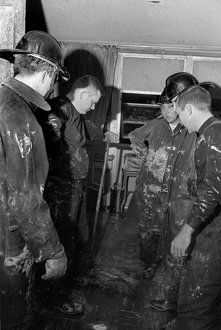 Wally Sinwell of St. Louis, right, who used hall extinguishers to contain the blaze, looks at birthday cake whose candles ignited paper, while firemen view the room.