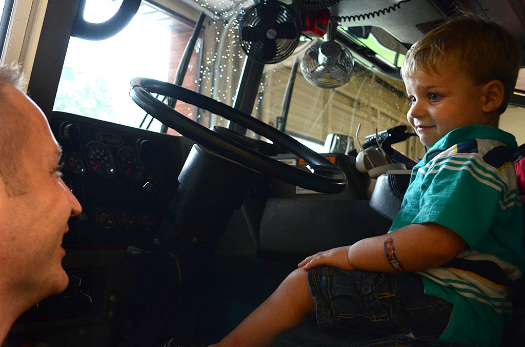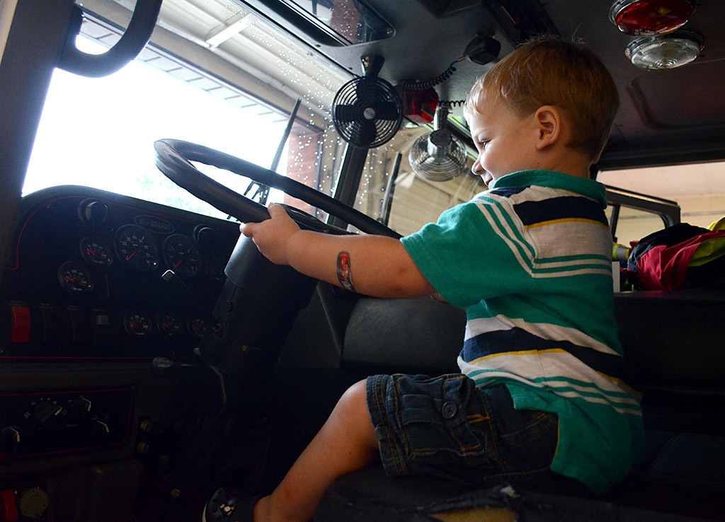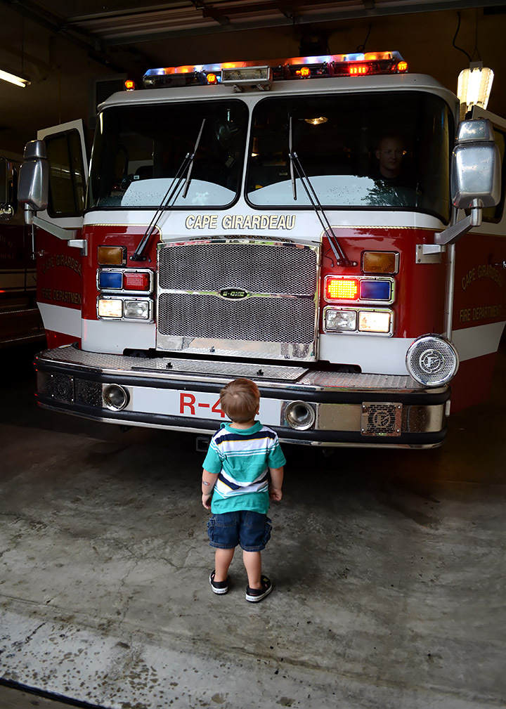 In 2013, my grandson Graham came to Cape from Florida to visit his great-grandmother. Of course, we had to go look at the fire trucks. He was impressed with the size of the apparatus, and dug “driving” it and blowing the siren, but he wasn’t quite ready for the sound of the air horn, as you can tell in one of the photos.