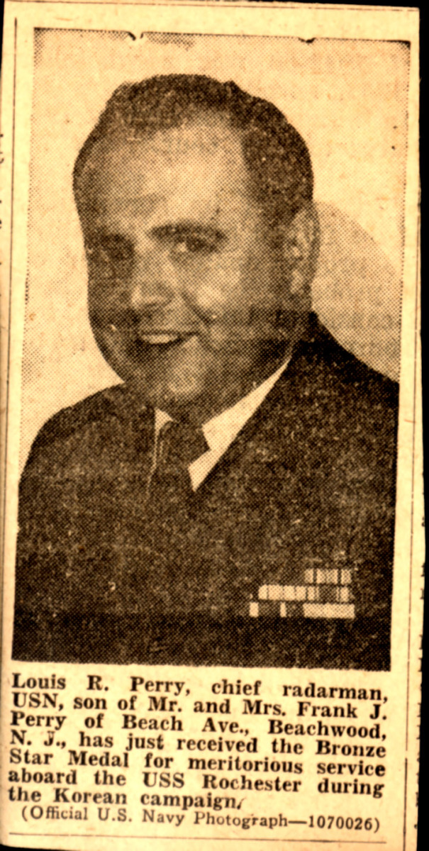 This short newspaper brief tells about all I know right now about Lila’s Uncle Louis R. Perry, who served in the Navy during World War II and the Korean War. He was awarded the Bronze Star for meritorious service during the Korean campaign.
