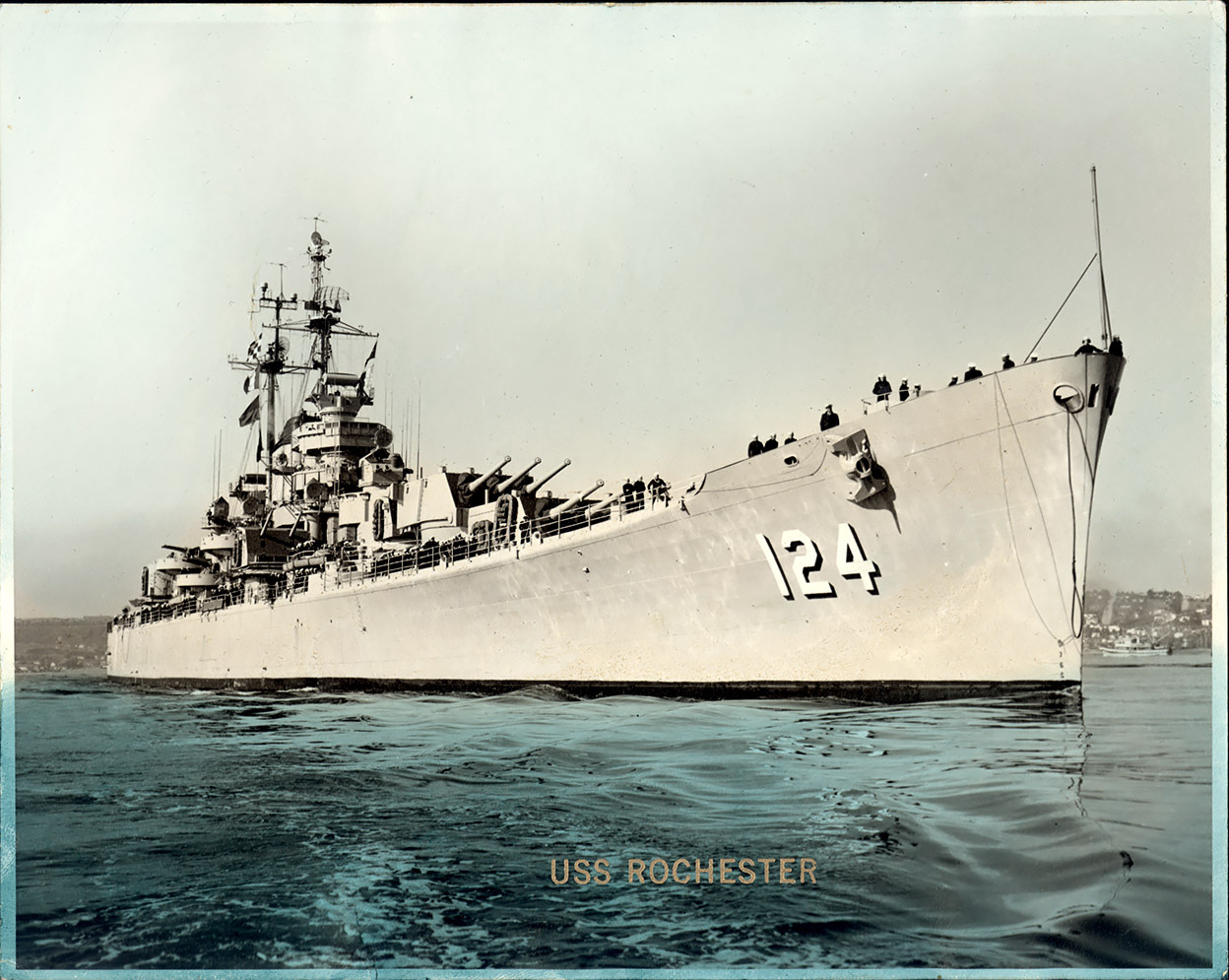 On Sept. 13, 1950, The Rochester provided support for the troops landing on Inchon. On Sept. 17, two Korean aircraft that were mistakenly thought to be friendly, dropped four bombs on the ship. Three of them missed, and the fourth smashed the ship’s crane, but failed to detonate.