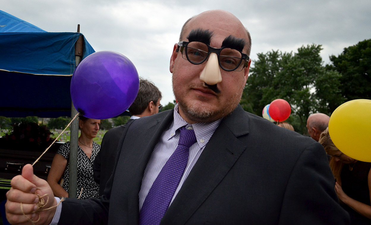 David asked if there was anything wrong with scratching something onto the top of the casket. There were no objections, so he carved on it, “See you later,” the phrase Mother always used instead of “Goodbye.” Before long, a bunch of us were leaving last messages. David’s daughters tossed bridal bouquets on the casket, and Son Matt left behind Groucho Marx glasses (more about that later).