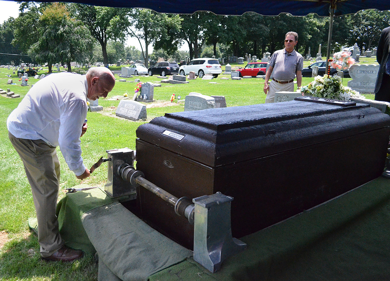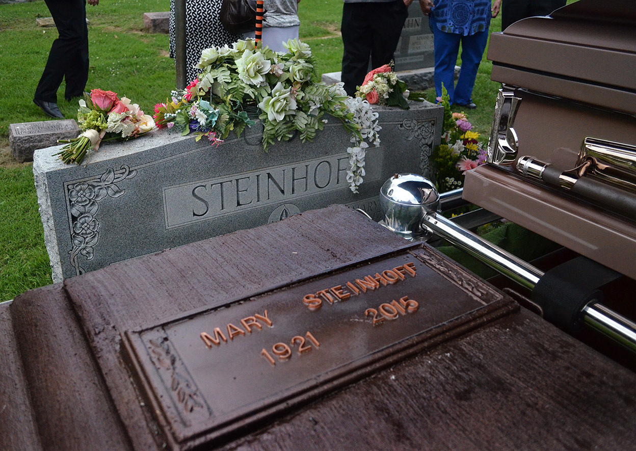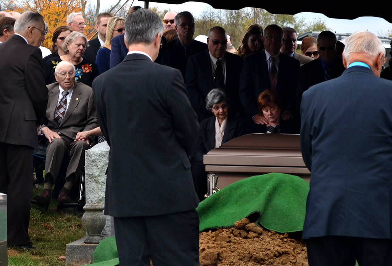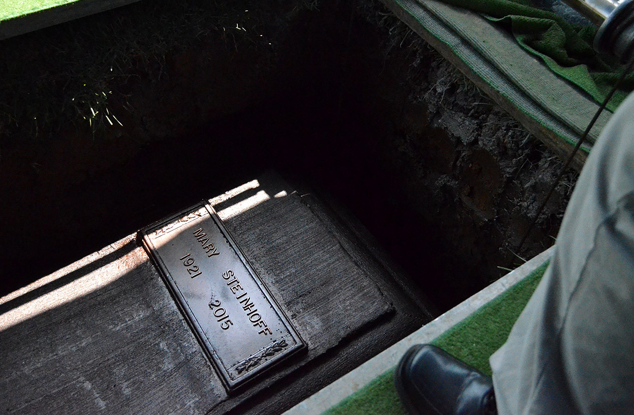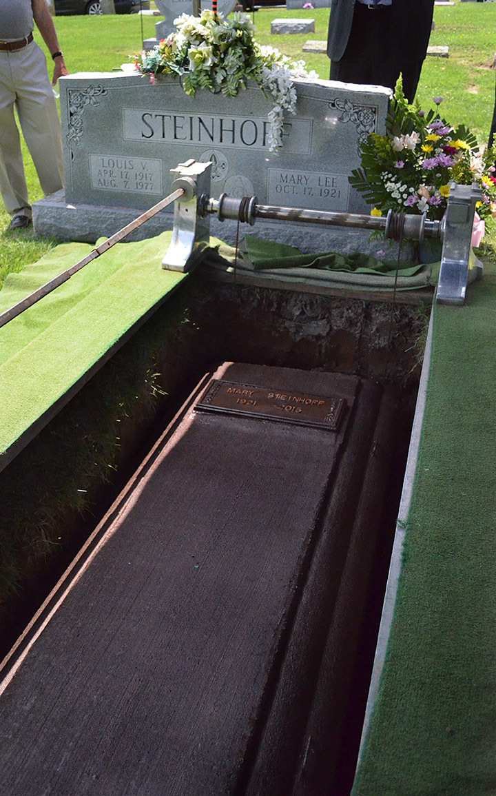 We Steinhoffs are curious folks, so Brother David asked the young grave digger (I don’t know if that’s his official title) lots of questions. He let David push the button that lowered the casket into the vault, but explained that the vault and casket weighted about 2,300 pounds, so a heavier cable set was used to finish the job. David turned the crank that lowered the vault into its final resting place.