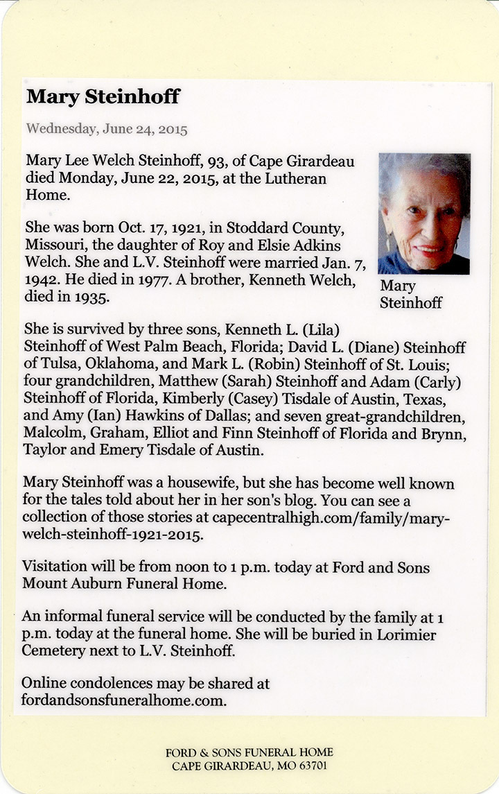 Thank you for all the cards you sent to Mother at the Lutheran Home, and thank you for the support and love you have sent to the Steinhoff family.