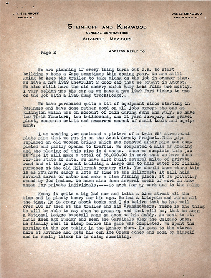 We have moved the trailer to Cape and have parked it on Hyway 61 near the Colonial Restaurant in a private-owned yard. Kenny likes it back at Cape and has several playmates. Kirkwood has one boy 6 months older than Kenny and one girl that is just beginning to go to school.