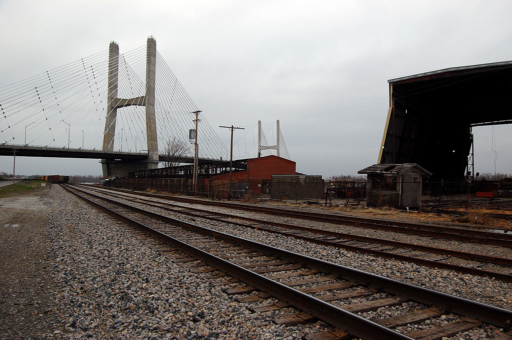 My mother and I were cruising down by Missouri Drydocks at the end of the day, when I heard a train whistle off in the direction of downtown. I thought this might make a cool shot that tied together the river, auto traffic on the bridge and a train whizzing by. If a plane would just fly into the frame and someone would walk by, I’d have all forms of transportation covered in one photo.