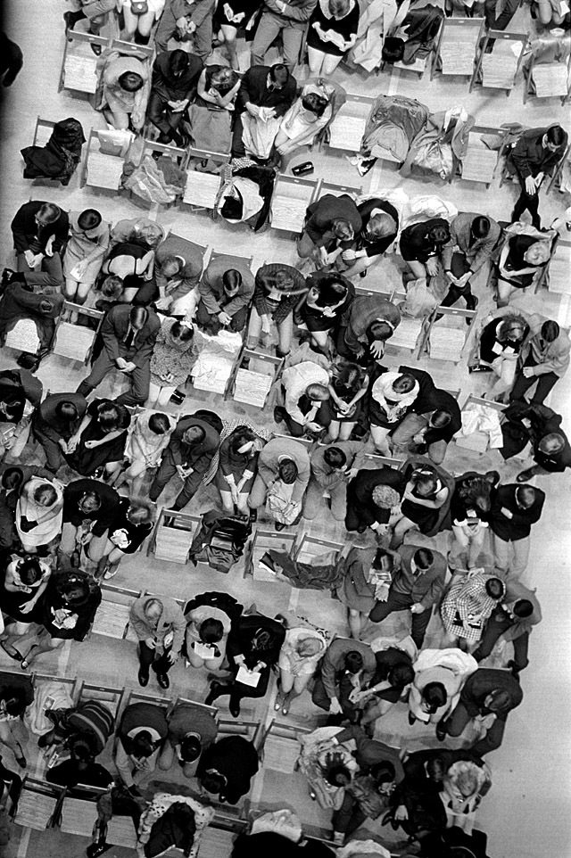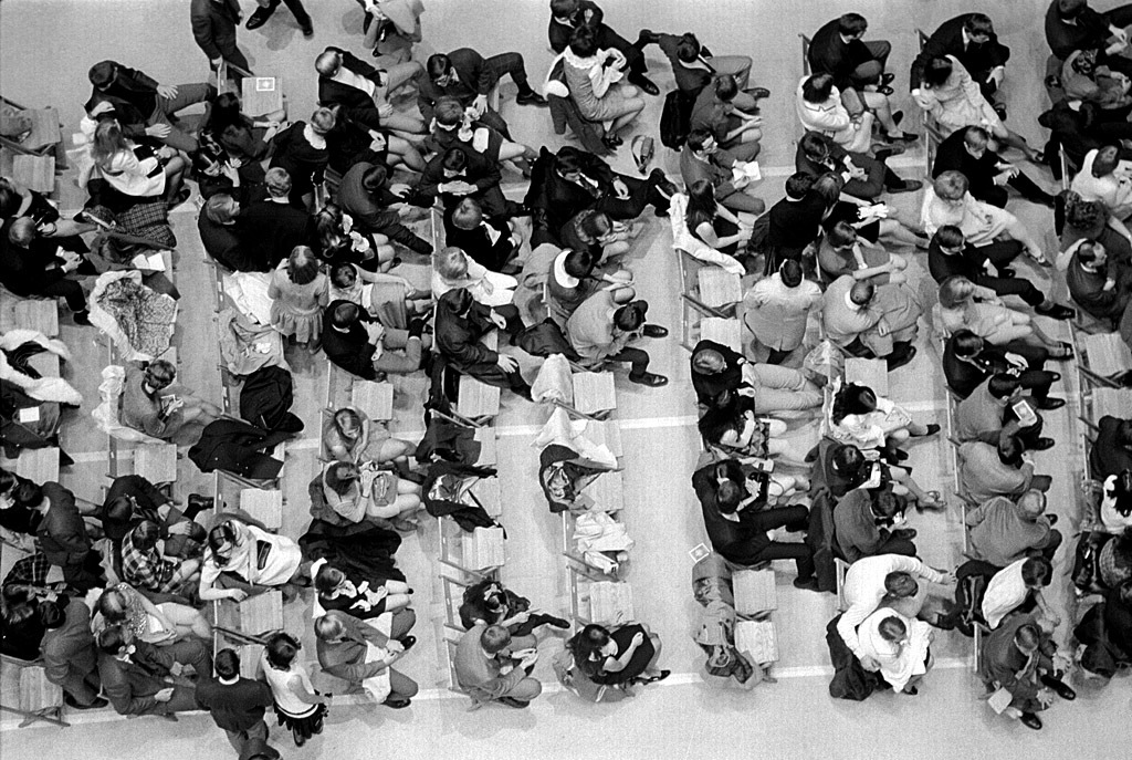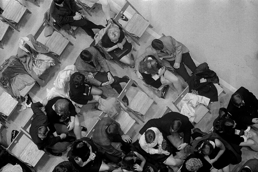 I was surprised to see how well-dressed the audience was. This is a folk-rock concert, so you’d expect to see a lot of casual hippie-type clothing, but most of the guys have on suit coats, if not ties. Hair lengths are Kennedyesque, not shoulder-length. Skirts are delightfully short.