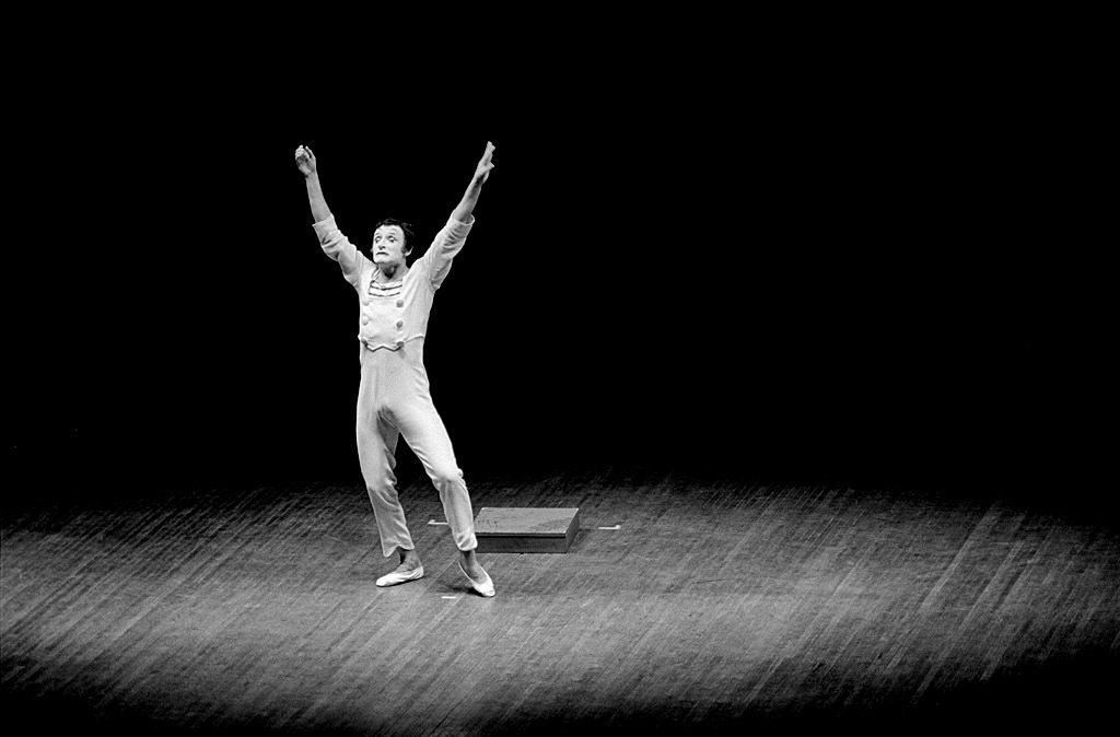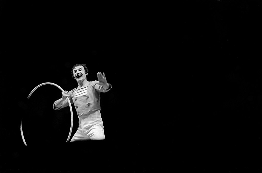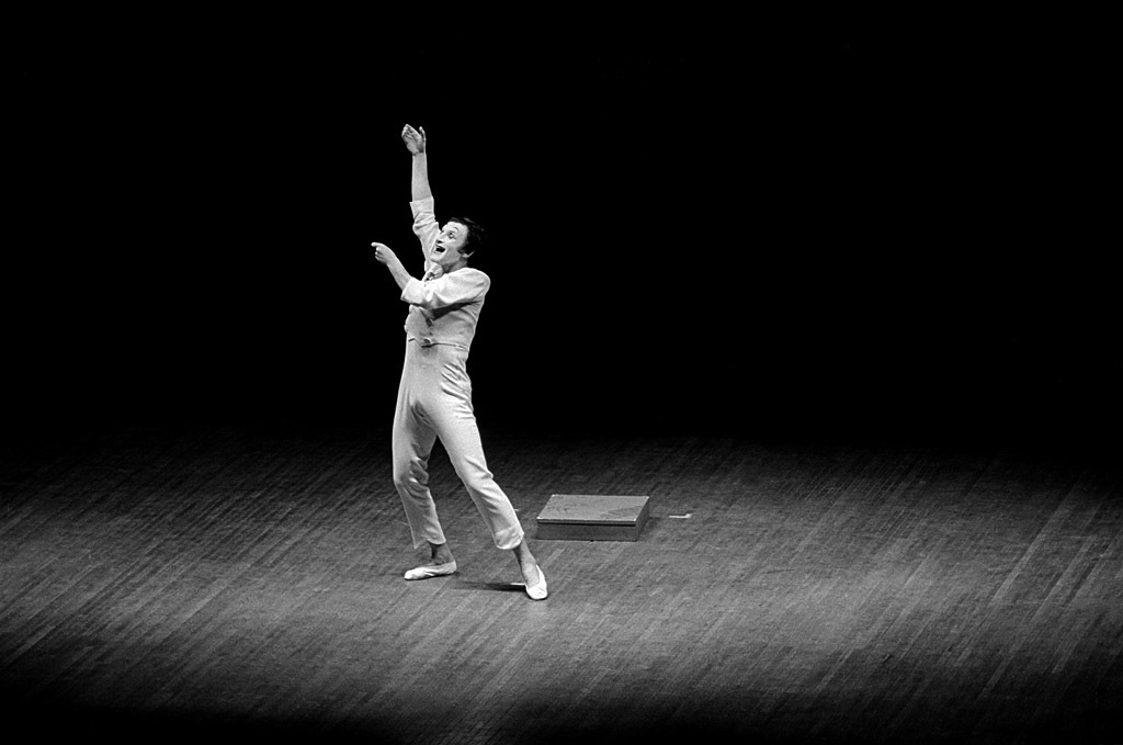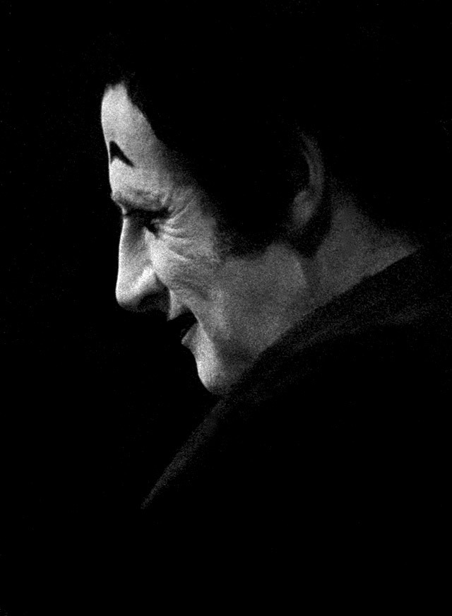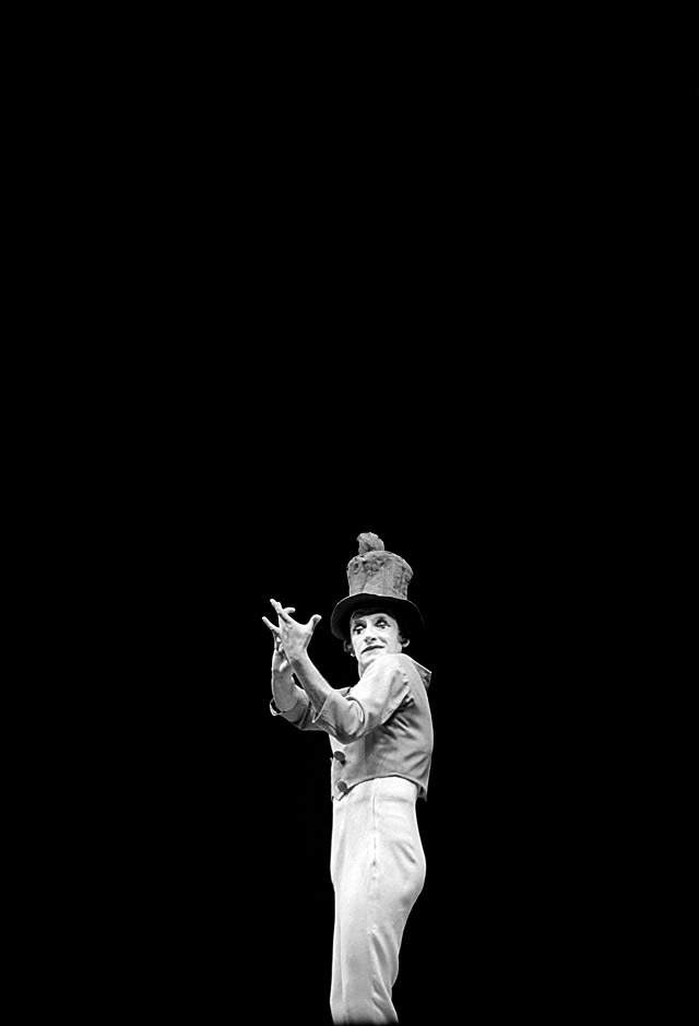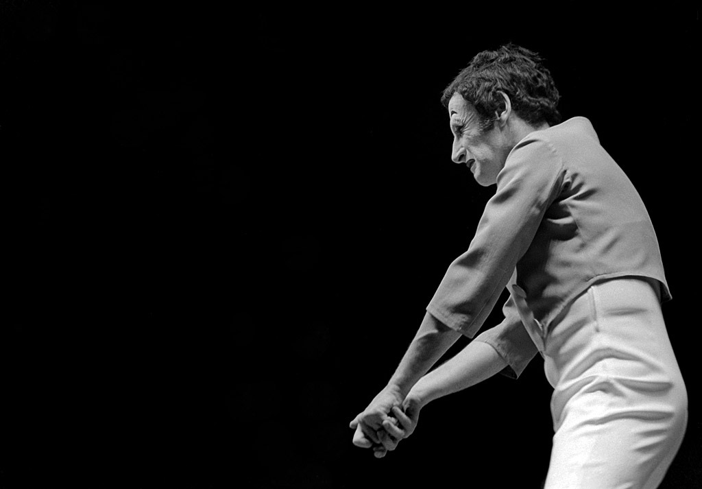 This was a performance where it really paid off to show up early enough to take an incident light reading on the stage before the show began. If I had tried to use a standard reflective light meter, it would have been fooled by the ocean of blackness surrounding Marceau. An incident light meter measures the light falling onto the subject rather than the light reflecting off the subject. That was my preferred method of metering when I could use it. Luckily, I was able to get the spot operator to fire it up long enough for me to get a reading.