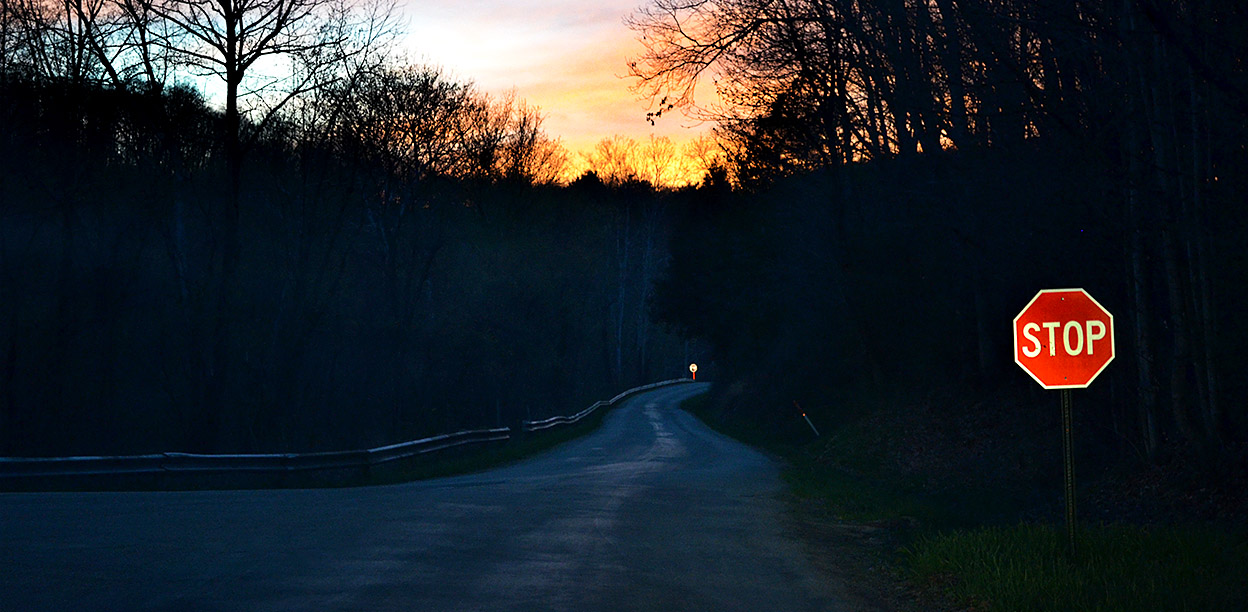 Just as I was pulling up to the main road, my headlights lit up a stop sign, much like one I photographed on Water Street. (Click on the photo to make it larger.)