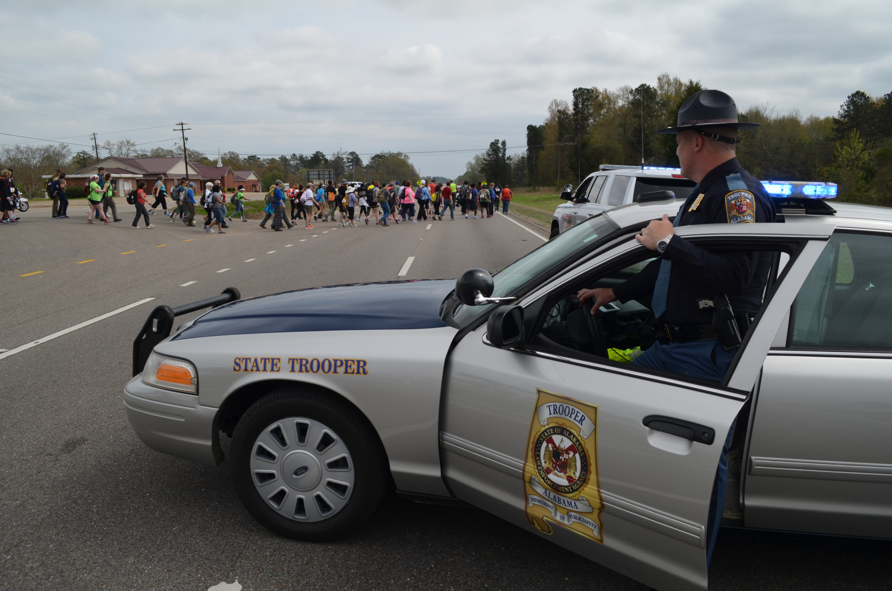 Not far from the center, we ran into the marchers stopped at a convenience store. I managed to get in behind them and drove up the shoulder of the road until I ran into this trooper. He gave me a questioning look, but became friendly when I stepped out with my camera gear. “I thought you might have had some kind of emergency and needed to get by,” he said.